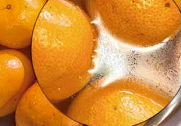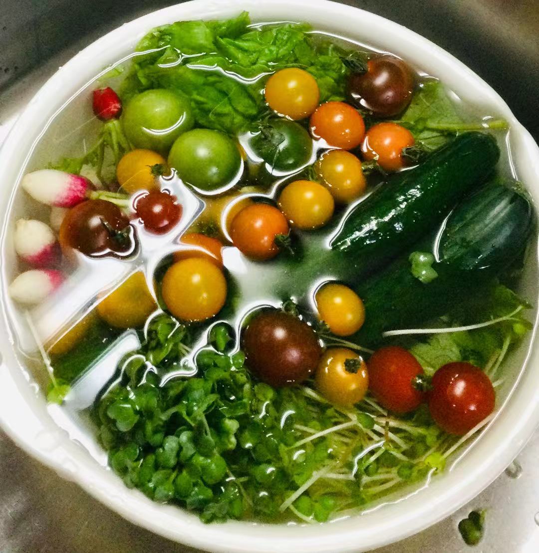 蔬菜水果经过安心食卓水溶液的浸泡后,产生有污渍的油膜,除了杀菌以外,农残也被清除出来。